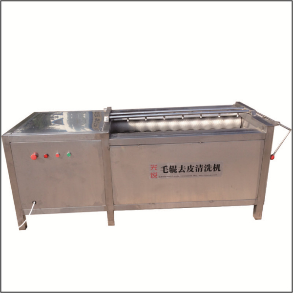 根莖去皮機工作時,是將根莖類蔬菜或球類果品放置在幾根可滾動的毛刷輥上在組成的U型料斗里使物料與旋轉(zhuǎn)的毛刷輥接觸產(chǎn)生表面摩擦,清水從噴淋水管中噴出沖洗物料,從而達到洗凈的目的。